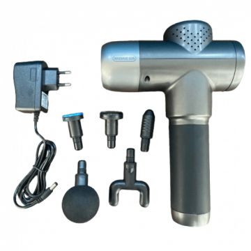 Súng massage cầm tay mini (còn gọi là máy massage tự rung) có thiết kế và công dụng gần như chiếc máy massage cầm tay, với 5 đầu matxa thiết kế khác nhau chuyên dụng để thư giãn giảm đau nhức. Kiểu dáng mạnh mẽ, tay cầm chắc chắn nhỏ gọn, dễ dàng mang theo di chuyển hoặc tập luyện để thư giãn cơ bắp. Sản phẩm Súng massage cầm tay Massage GUN (Pin Sạc) sử dụng pin sạc dung lượng 2.400 mAh có thể sử dụng trong thời gian dài, vô cùng tiện dụng. Trang bị 6 tốc độ massage rung nhẹ tới mạnh, người dùng tùy chỉnh theo nhu cầu sử dụng.